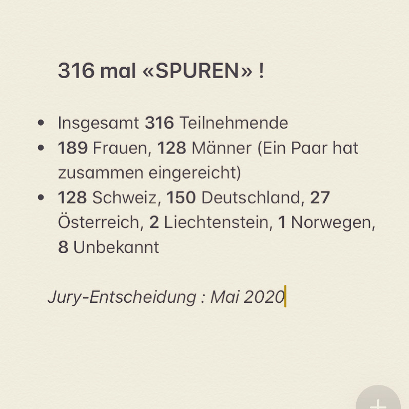 Nun geht es ans Lesen. Die Jury tagt im Mai. Alle Teilnehmenden werden bis spätestens Ende Mai über das Resultat informiert.